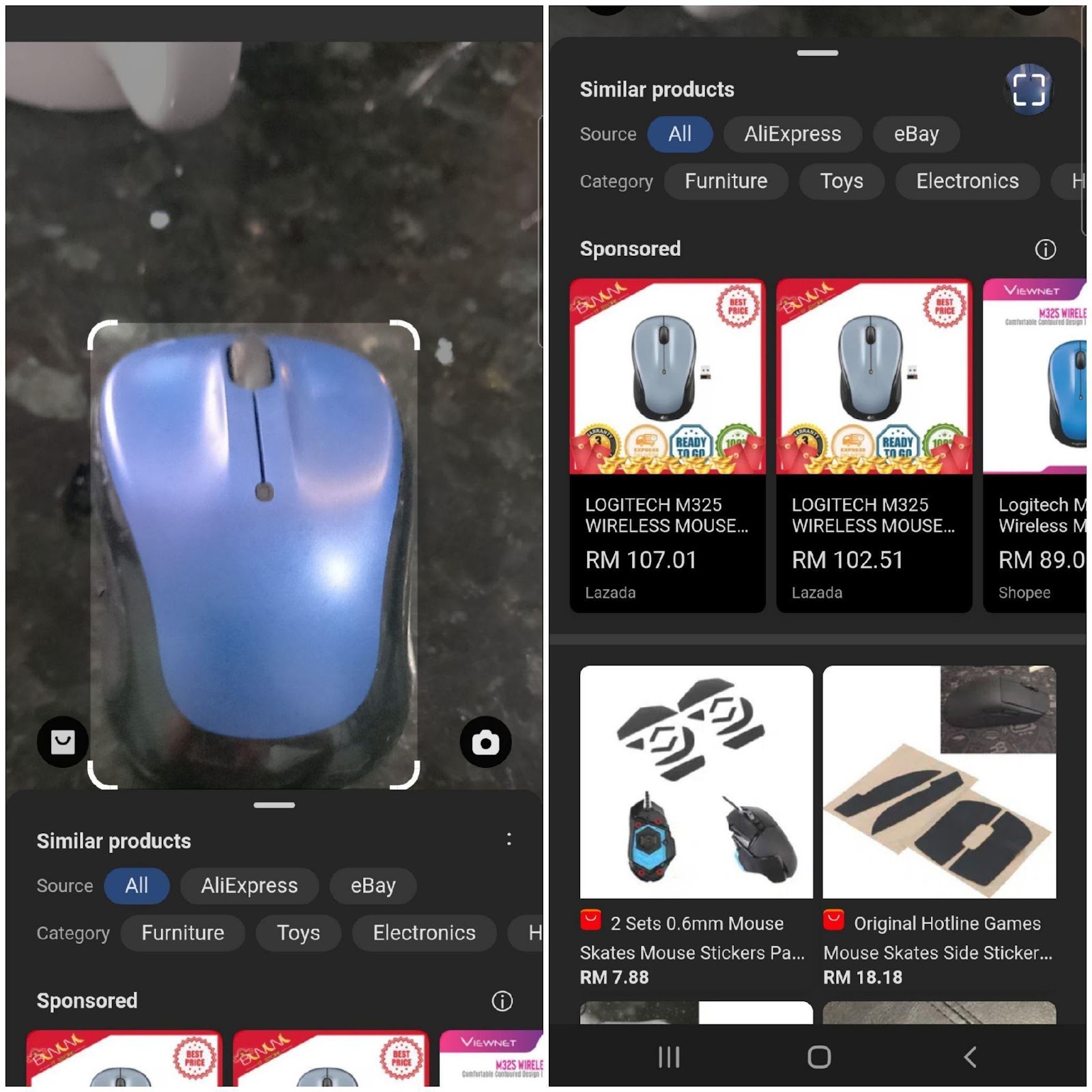 下图可见,将照片上传到Shopping,PS就能迅速定位滑鼠,列举颜色和型号相似的商品。