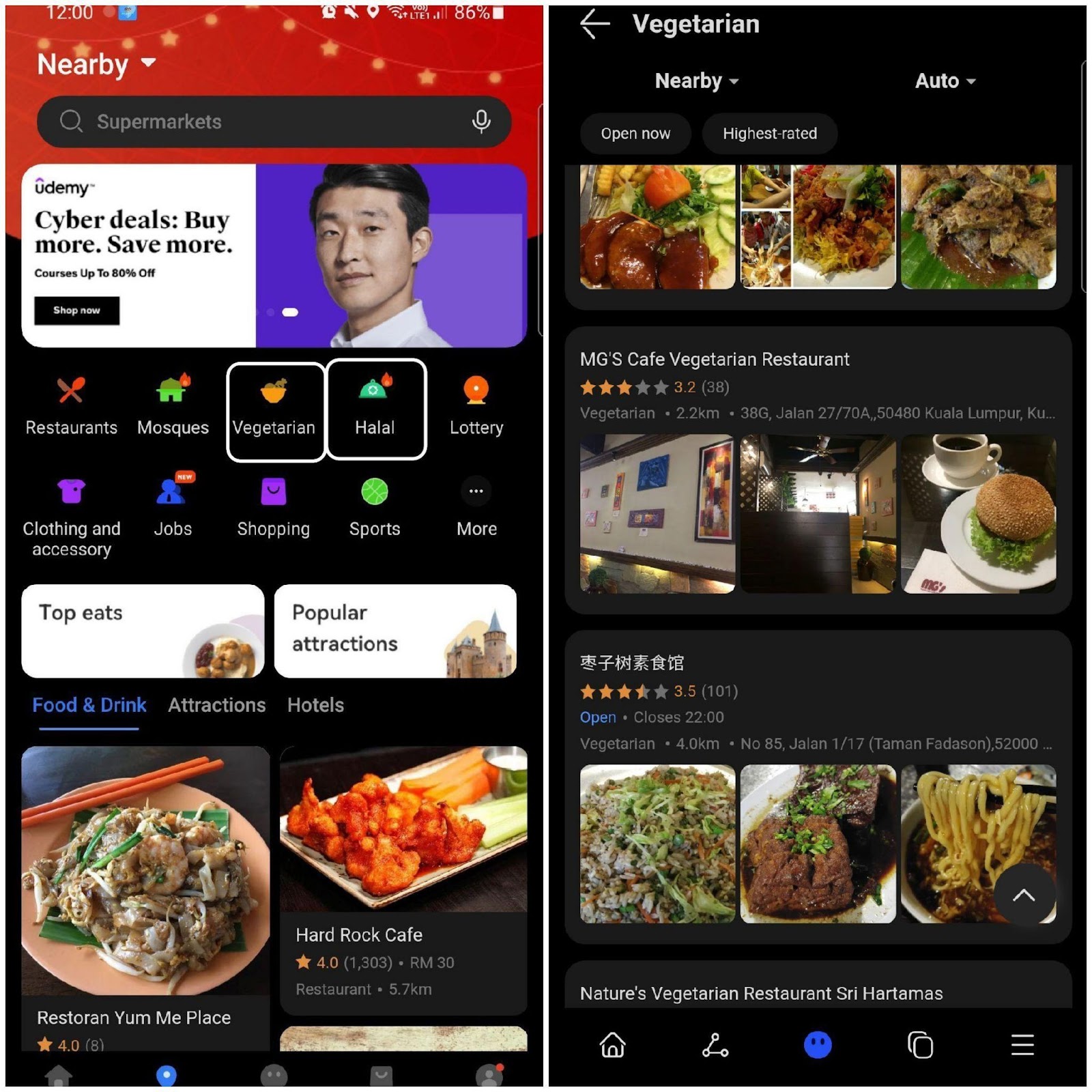 魔鬼藏在细节中,饮食推荐不仅会显示餐厅评价,还各别分类素食和清真食品,体现 Nearby的细腻和人性化!