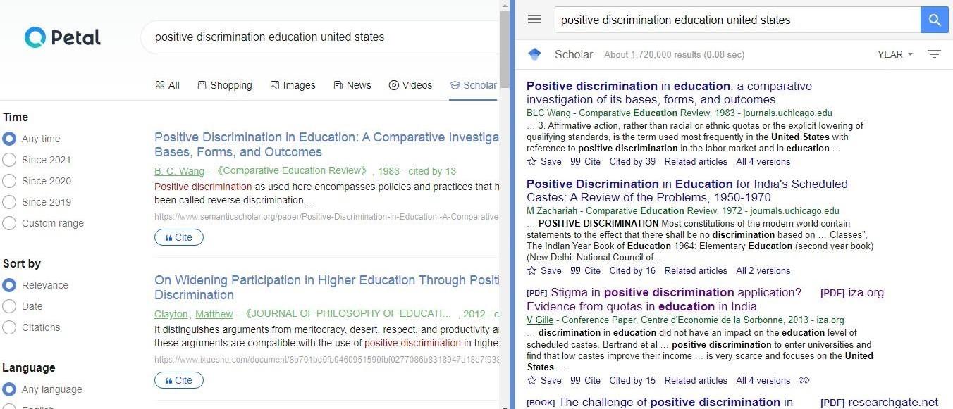 下图:学术搜索,PS和谷歌结果相似,都具更仔细的归类搜索,但PS的排版更清晰