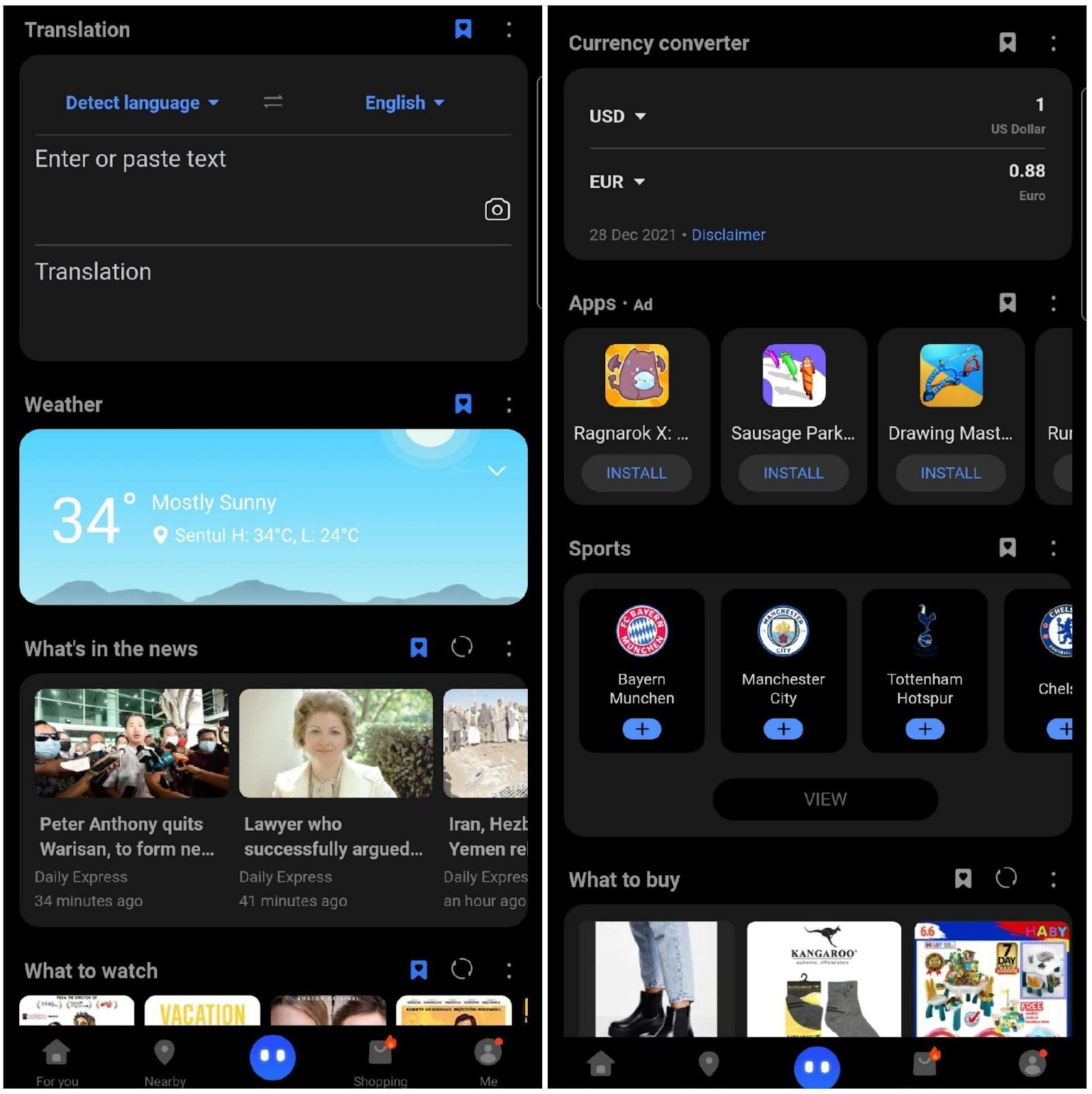 PS信息流(newsfeed)提供翻译、天气预报、汇率换算等各种实用功能,娱乐推荐和即时新闻及时性强,用户也可客制化首屏的快捷方式 (shortcuts)。