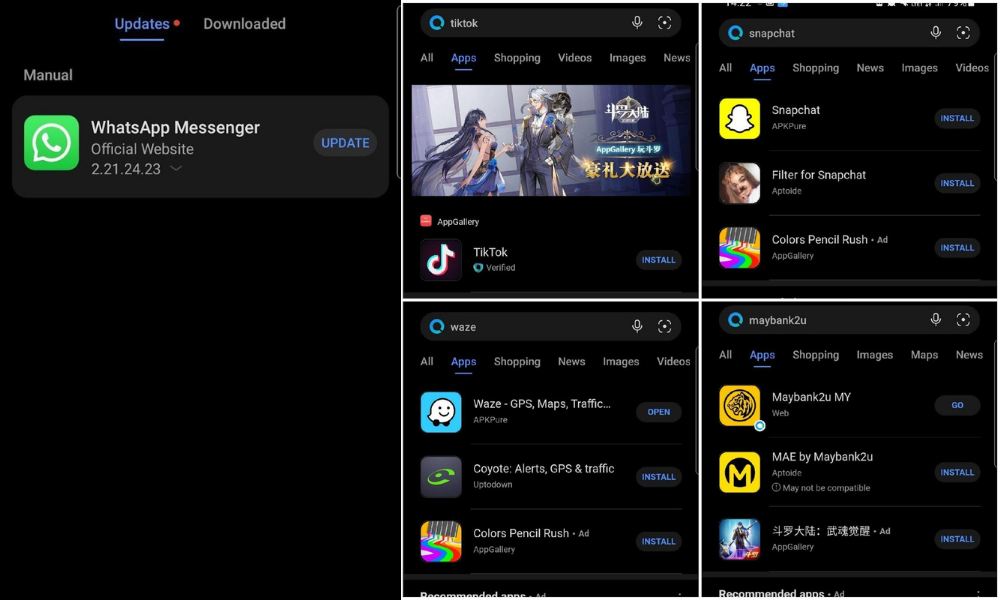 即便没有Google Play Store,用户也能通过PS搜寻和下载APP,APP选择广泛,包括海外社媒如TikTok, SnapChat,或本地导航Waze和银行APP; 点击 “downloads”,便可同时更新所有APP。