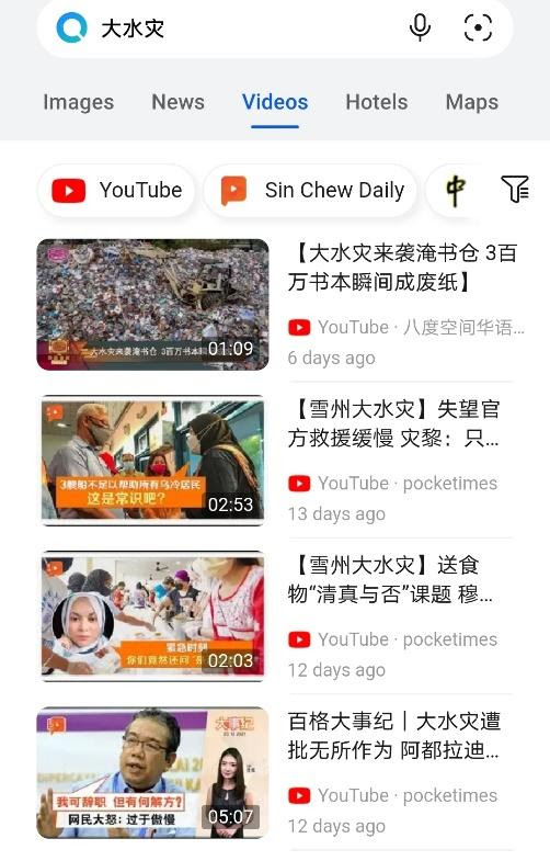 圣诞前夕的世纪大水灾还记忆犹新吧?小编输入‘大水灾’后按 Videos (视频) 选项,跟着来就是一系列出现在YouTube的相关视频,让我通过‘视觉’更了解与灾情相关的事件。