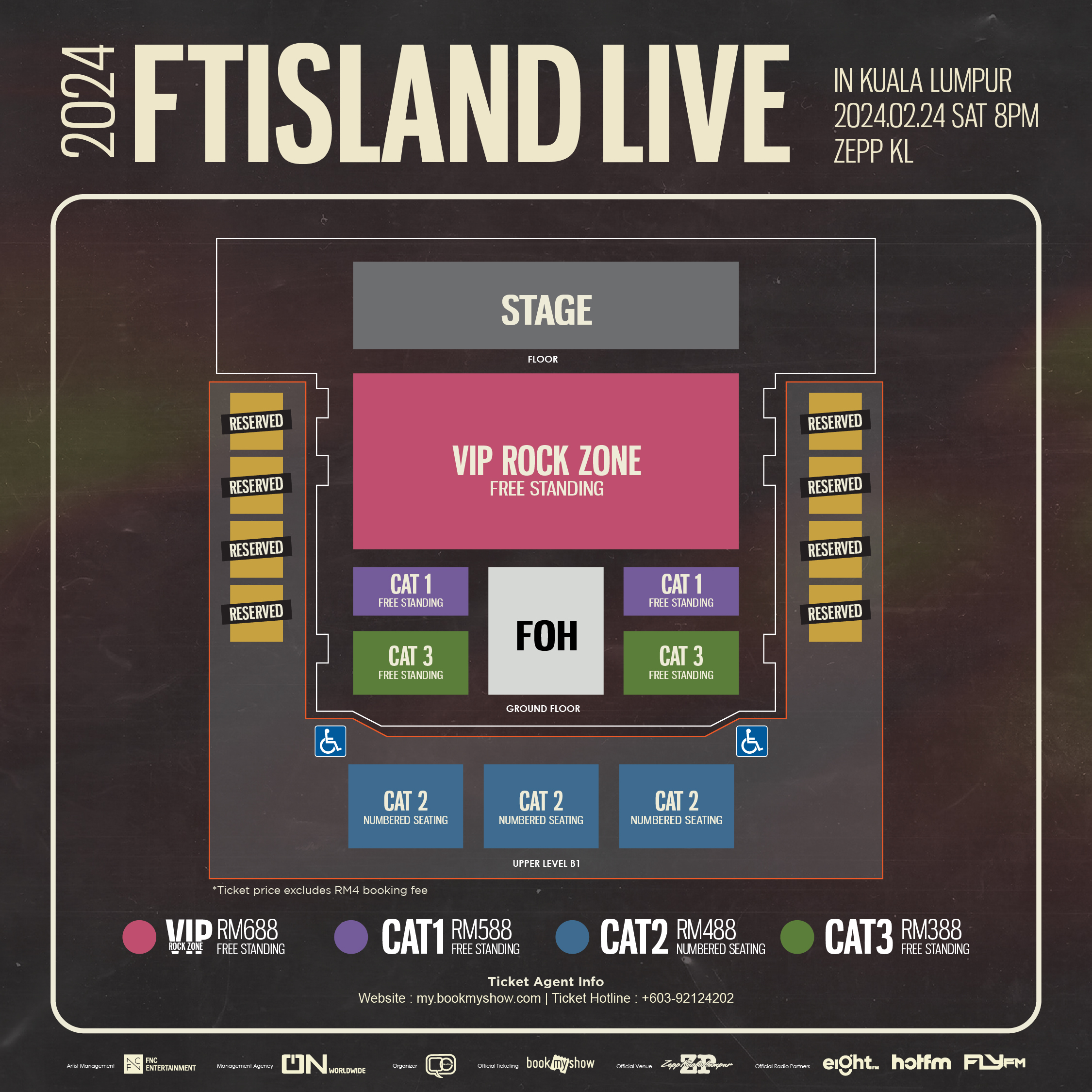 Konsert yang dinantikan "2024 FTISLAND LIVE 'HEY DAY' IN KUALA LUMPUR" akan berlangsung di Zepp KL pada 24 Februari 2024, jam 8:00 malam. Tiket akan dijual mulai jam 12:00 tengah hari, Khamis, 30 November, di my.bookmyshow.com dan talian hotline +603-92124202. Harga tiket adalah seperti berikut: RM688 (VIP Rock Zone Standing), RM588 (CAT 1 Standing), RM488 (CAT 2 Seating), dan RM388 (CAT 3 Standing). Harga tidak termasuk bayaran pemprosesan sebanyak RM4, dan setiap individu boleh membeli maksimum 6 tiket.
