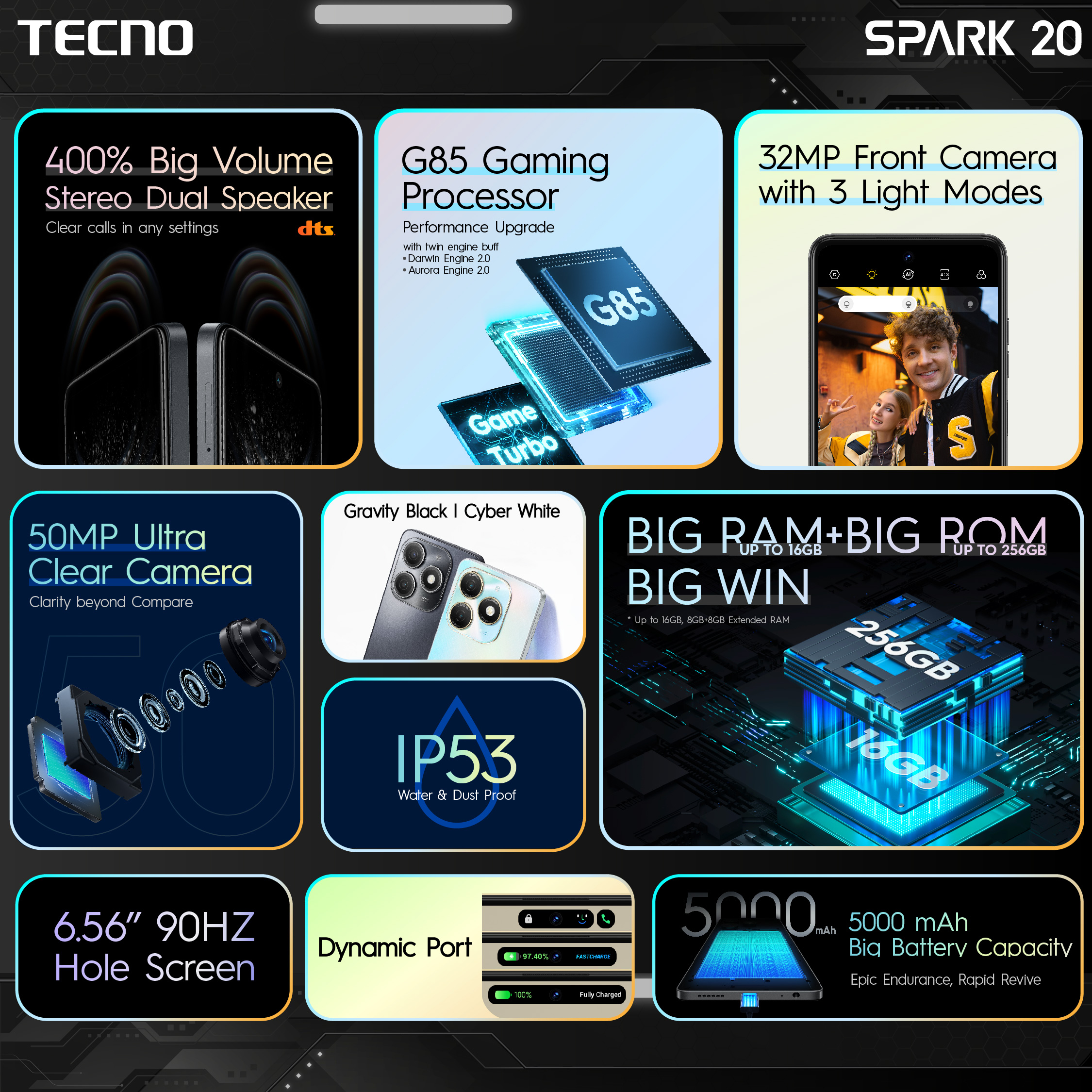 Selain daripada ciri-ciri g’gaming yang ditawarkan, model Spark 20 yang terbaru ini mengejutkan para penggunanya dengan kecanggihan kameranya. Model ini telah didatangkan dengan kamera 32MP ‘ Glowing Selfie’ lengkap dengan 3 mod cahaya. Pengguna boleh melaras pelbagai jenis pencahayaan dengan mudah bagi mendapatkan suafoto yang sempurna sesuai dengan keadaan sekeliling dengan menggunakan ‘Dual Color Temperatre Flash’. Peranti ini juga dianggap ‘versatil’ dalam mengambil gambar suafoto berdifinisi tinggi yang menakjubkan menerusi teknologi potret AI yang bertindak untuk mengimbangkan keterangan sesuatu gambar agar lebih sempurna di dalam setiap sudut.