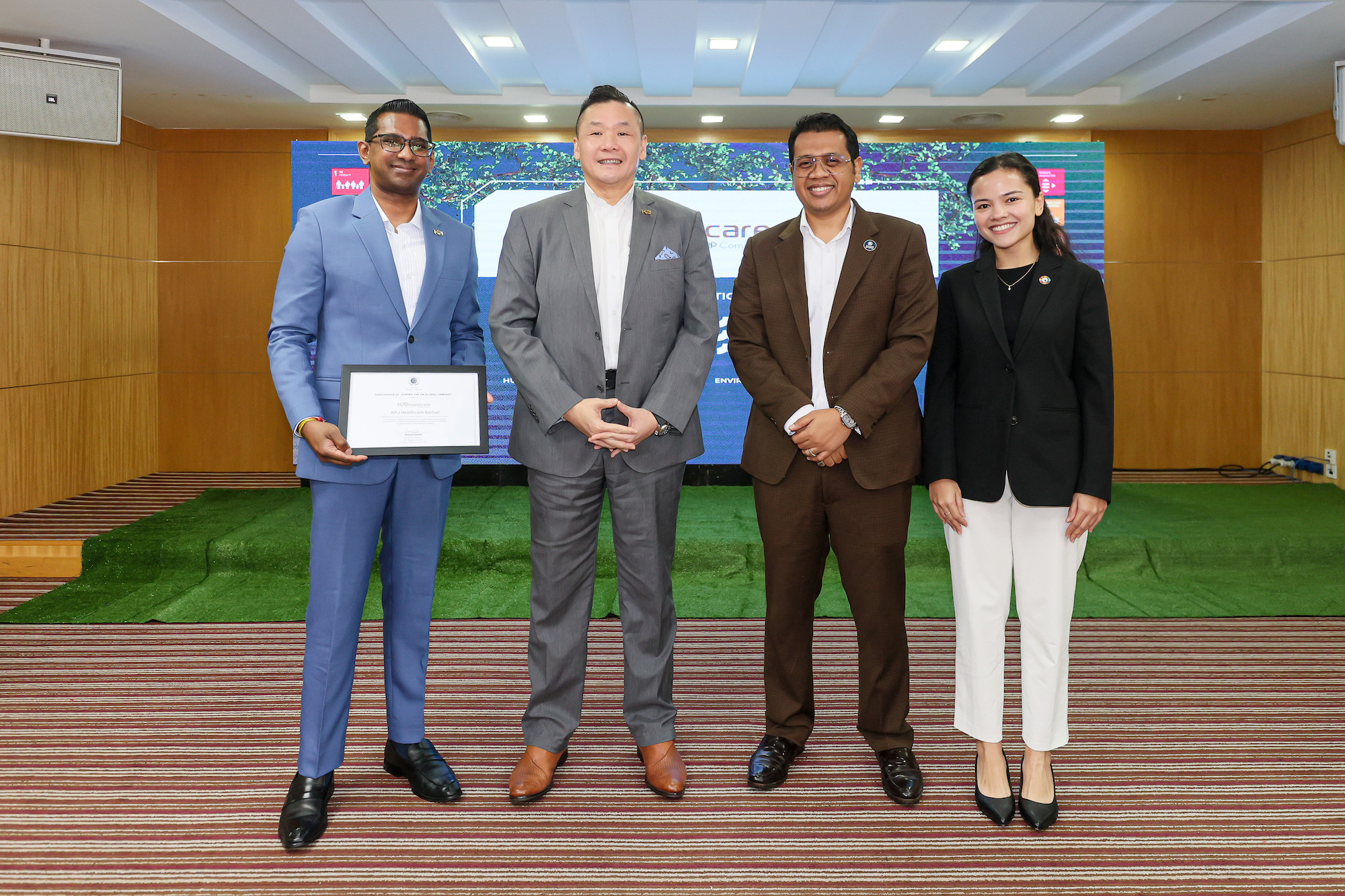 Gambar di atas: Chin Keat Chyuan, Presiden dan Pengarah Urusan KPJ Healthcare Berhad (dua dari kiri) menerima Sijil Pengiktirafan Penyertaan UN Global Compact dari Faroze Nadar, Pengarah Eksekutif UN Global Compact Malaysia dan Brunei (dua dari kanan), diiringi oleh Saravanan Desigamanie, Ketua Kemampanan Kumpulan KPJ Healthcare Berhad (kiri) dan Nabilah Doyle, Ketua Pengacaraan dan Komunikasi UN Global Compact Malaysia (kanan).