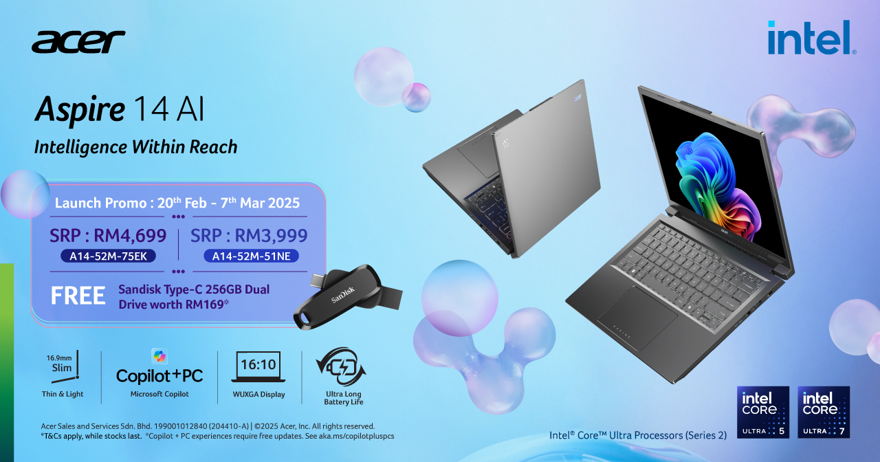 In conjunction with the launch, customers who purchase the Aspire 14 AI laptop before 7 March 2025 will receive a SanDisk Type-C 256GB Dual Drive worth RM169.