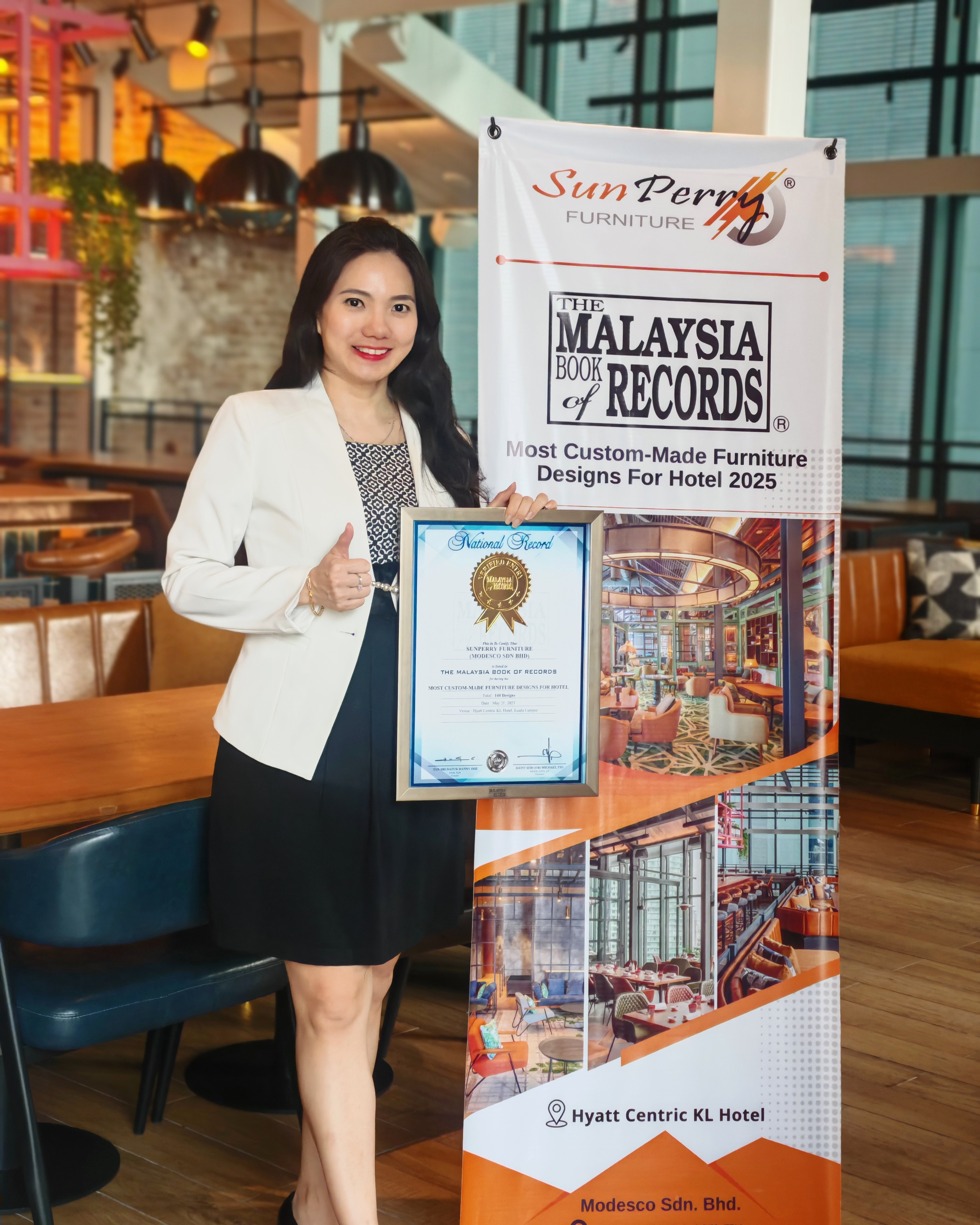 Sunperry Furniture, one of Malaysia’s leading designer furniture providers, has officially been awarded the Malaysia Book of Records title for “Most Custom-Made Furniture Designs for Hotels. (Total: 144 Designs) ” This prestigious honour recognises the company’s lasting contributions to the nation’s hospitality and interior design industries, built on over 16 years of excellence in bespoke furniture craftsmanship.