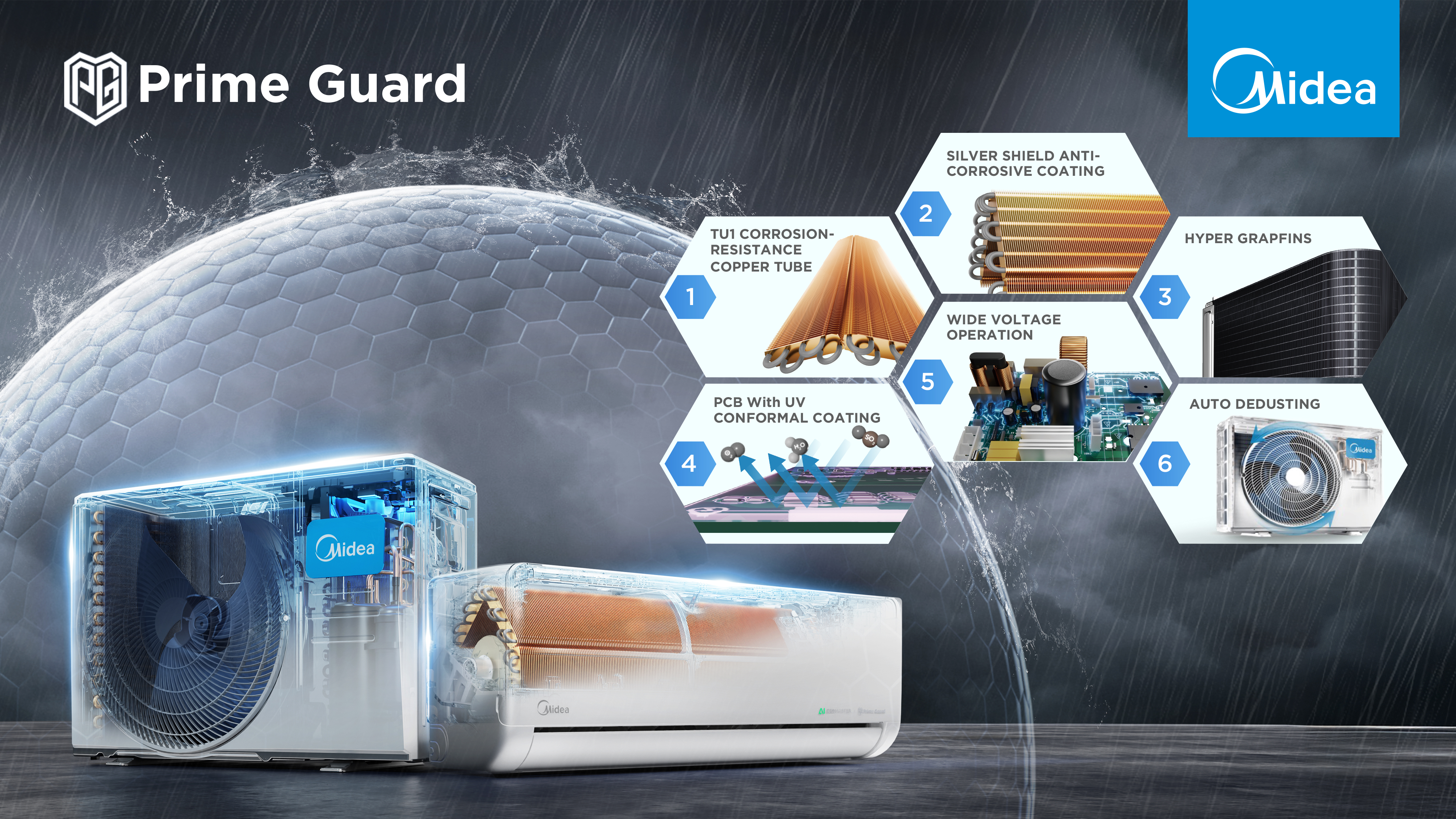 Engineered for the challenges of tropical climates, Midea’s inverter ACs are equipped with the PrimeGuard 6-Anti-Corrosion Technology, offering 360° protection for indoor and outdoor units. Critical components like heat exchangers, copper tubing, and PCBs are shielded from damage caused by heat, humidity, and corrosion.