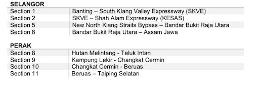 As of 31 March 2025, 8 out of 11 sections are operational, covering 180 kilometers across Selangor and Perak. Notably, the entire Perak alignment (120 km) has been fully completed. The operational sections as of 31 March 2025 are as follows: