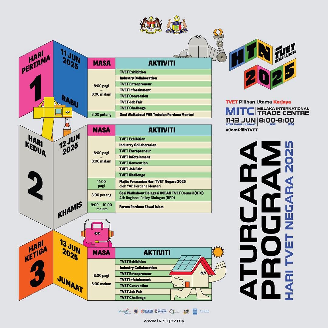 10th JUNE 2025 - Hari ini, Timbalan Perdana Menteri Pengerusi Jawatankuasa Majlis TVET, Ahmad Zahid Hamidi telah mempengerusikan Mesyuarat Penyelarasan Khas Hari TVET Negara 2025. Sambutan Hari TVET Negara 2025 akan berlangsung selama tiga hari bermula 11 hingga 13 Jun 2025 di Pusat Dagangan Antarabangsa Melaka (MITC), dengan sasaran kehadiran melebihi 150,000 pengunjung. Acara berimpak tinggi ini akan dirasmikan oleh YAB Perdana Menteri, Dato’ Seri Anwar Ibrahim, pada 12 Jun, menzahirkan iltizam Kerajaan MADANI dalam menjadikan Pendidikan dan Latihan Teknikal dan Vokasional (TVET) sebagai teras pembangunan negara.