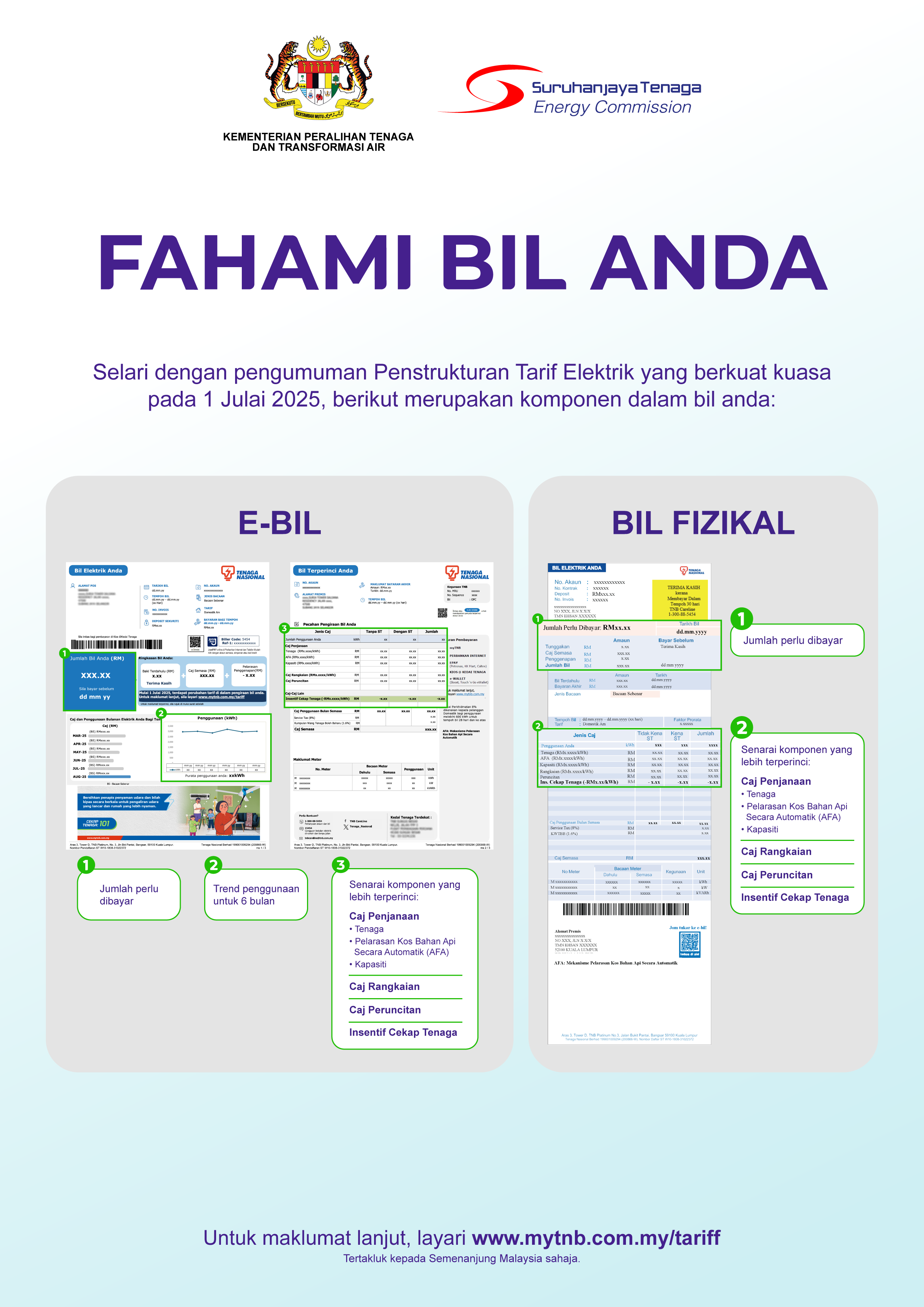 Selari dengan pengumuman Penstrukturan Tarif Elektrik yang berkuat kuasa pada 1 Julai 2025, berikut merupakan komponen dalam bil anda: