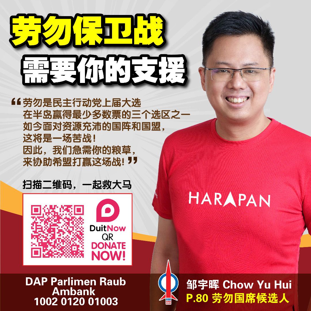 劳勿是民主行动党上届大选在半岛赢得最少多数票的三个选区之一,如今面对资源充沛的国阵,来势汹汹的国盟,我们迎来的是一场硬仗,劳勿国会选区辽阔,涵盖三个州席、十三个马来甘榜、十个华人新村,五个Felda、数个原住民村,甚至福隆港都是隶属劳勿国席,总选民超过七万人,也是国阵马华过去强固的堡垒区。我们现在还要面对国盟及斗士党的保守主义攻势,步履维艰。