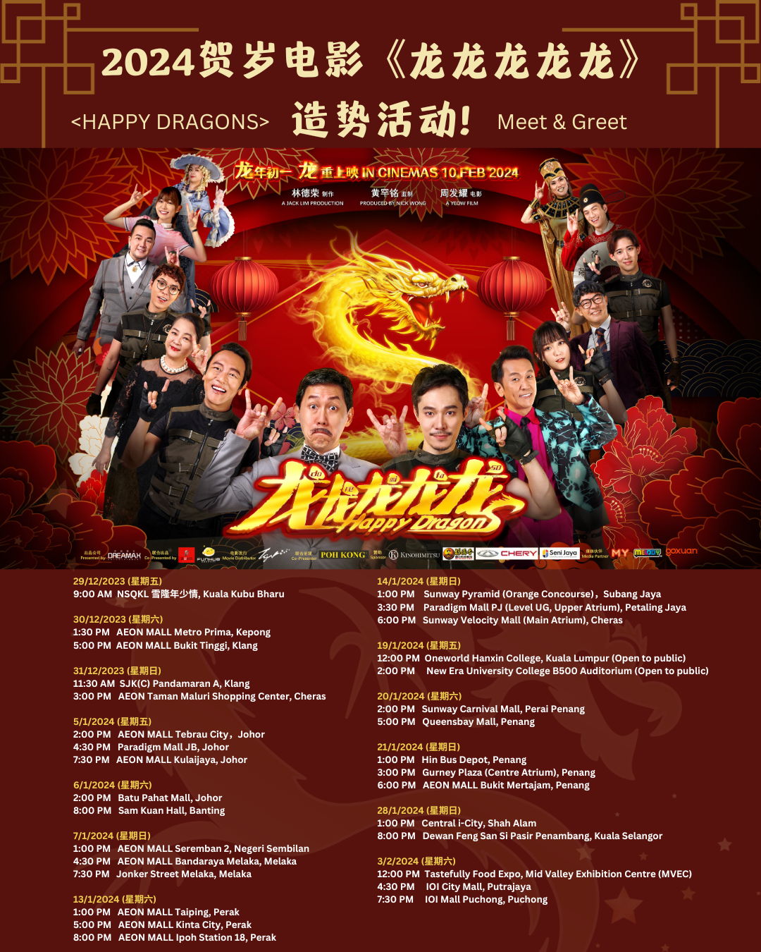 这次“龙龙龙龙龙”车队会在超过30场造势活动中的“架势”出巡,演员们会在现场与民众玩游戏、送红包及电影周边产品!另外,车队也号召民众们找“龙龙龙龙龙”车来打卡,因为车身上会有二维码(QR Code),民众只要扫码参加游戏,不止有小礼物可以带回家,还会有机会赢取RM88,888的现金大红包,势必要大家玩得尽兴!此外,现场还会有摊位售卖《龙龙龙龙龙》的电影周边产品,期许民众带着祝福,携手迎接2024龙年的到来!《龙龙龙龙龙》将在2024年2 月10日龙年精神上映!奖品方面还包括来自联合呈现Poh Kong、赞助商Kinohimitsu、福满香、CHERY及Seni Jaya呢!参与《五龙幸运大抽奖》不但能获得现金奖还可以得到更多春节福利大优惠呢!欲了解更多详情,请游览官方面子书 : Dreamax Entertainment 天翊娱乐。