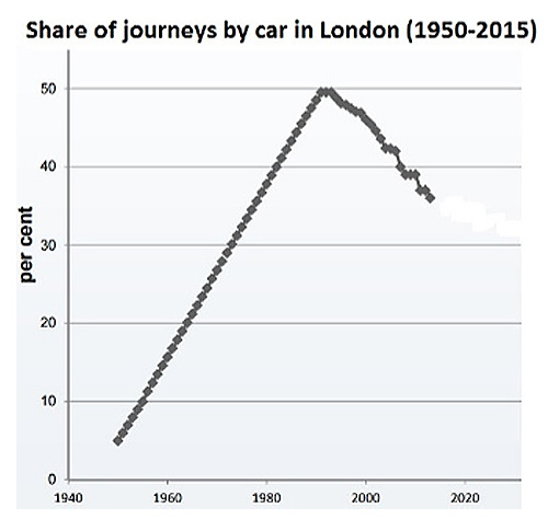An example can be drawn from the city of London, which the graph above shows its percentage of car modal share from 1950 to 2015 (Metz, 2016). Although transport policy emphasis in London switched from ‘vehicle focus’ towards ‘personal mobility and accessibility focus’ during the early 1980s, car modal share in London continued to grow towards the mid-1990s (Jones, 2016).