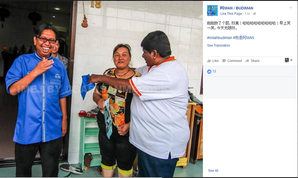 就在今早,专页放上一张照片,身穿蓝色国阵制服的布迪曼,在一户人家门口与两名妇女相聚,咧嘴大笑,留言写道:“刚刚放了个屁,好臭!哈哈哈哈哈哈哈哈哈!早上笑一笑,今天无限好。”