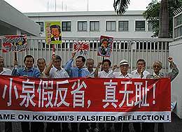 八大华青代表洪来喜表示,今年是二战结束60周年,但是小泉却于这个敏感时期前去参拜神社,这表示小泉根本没有任何的悔改之意。