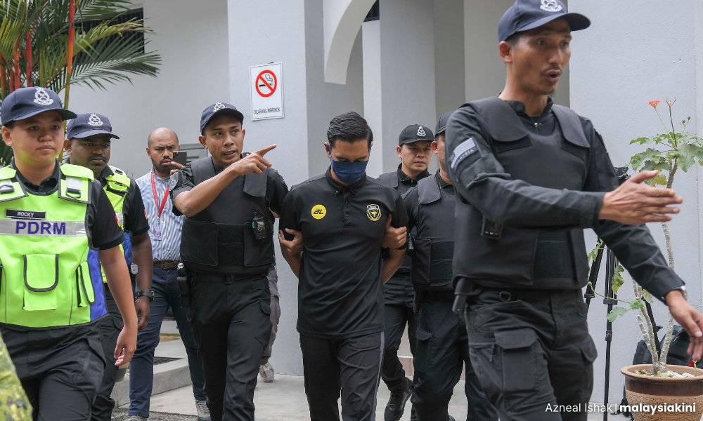 Muhammad Alif yang berpakaian kemeja-T tiba di mahkamah diiringi anggota polis dan diwakili peguam bela Nur Aida Md Zainuddin dan Aida Jaafar.