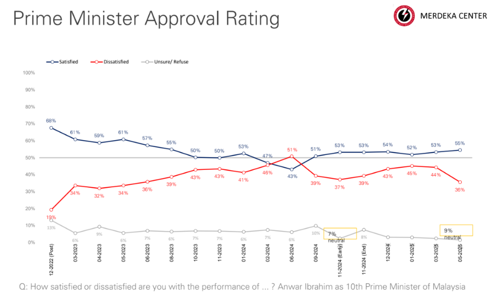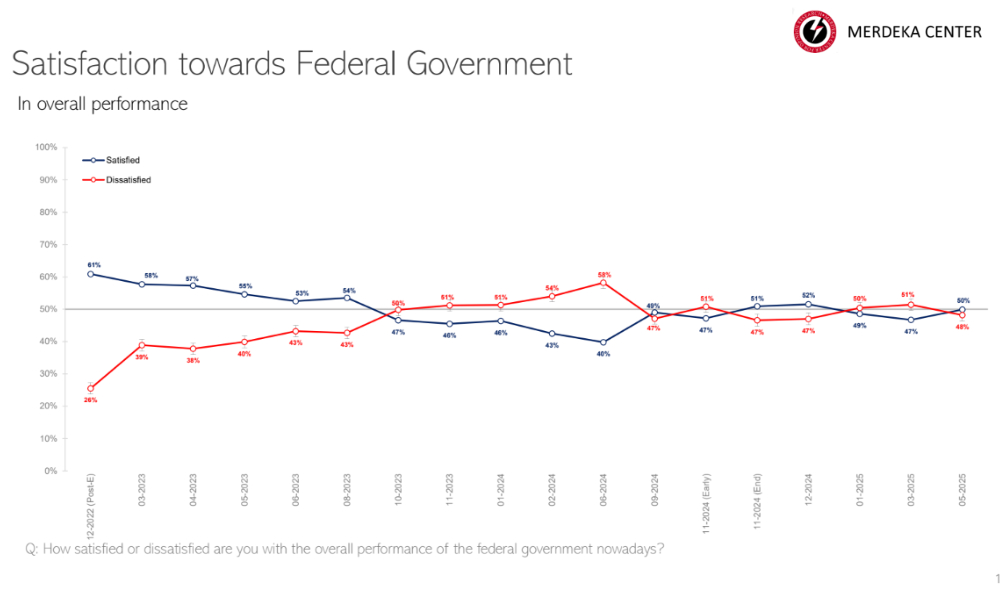 “Dari sudut penilaian terhadap kerajaan persekutuan, tinjauan menunjukkan kadar sokongan meningkat kepada 50 peratus pada Mei 2025 berbanding 40 peratus pada Jun 2024.