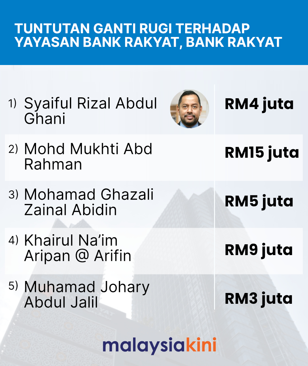 Syaiful Rizal sebagai plaintif pertama menuntut lebih RM4 juta daripada Yayasan Bank Rakyat dan Bank Rakyat, antaranya gaji hampir tiga tahun berjumlah RM1.3 juta, elaun perubatan RM1.44 juta serta bonus tiga tahun hampir RM1 juta.
