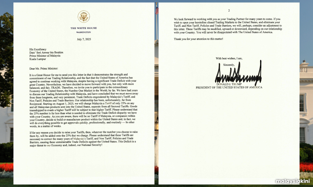“Bermula 1 Ogos, semua import dari Malaysia akan dikenakan tarif sebanyak 25 peratus,” kata Trump dalam surat rasmi yang dialamatkan kepada Perdana Menteri, Anwar Ibrahim.
