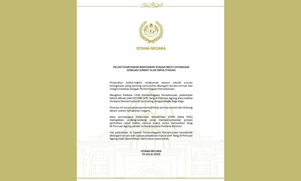 Istana memberi peringatan kepada semua pihak agar tidak mempolitikkan pelantikan hakim mahkamah atasan, sambil menegaskan bahawa ia adalah "urusan kenegaraan yang penting serta perlu ditangani secara cermat dan integriti selaras dengan Perlembagaan Persekutuan.”