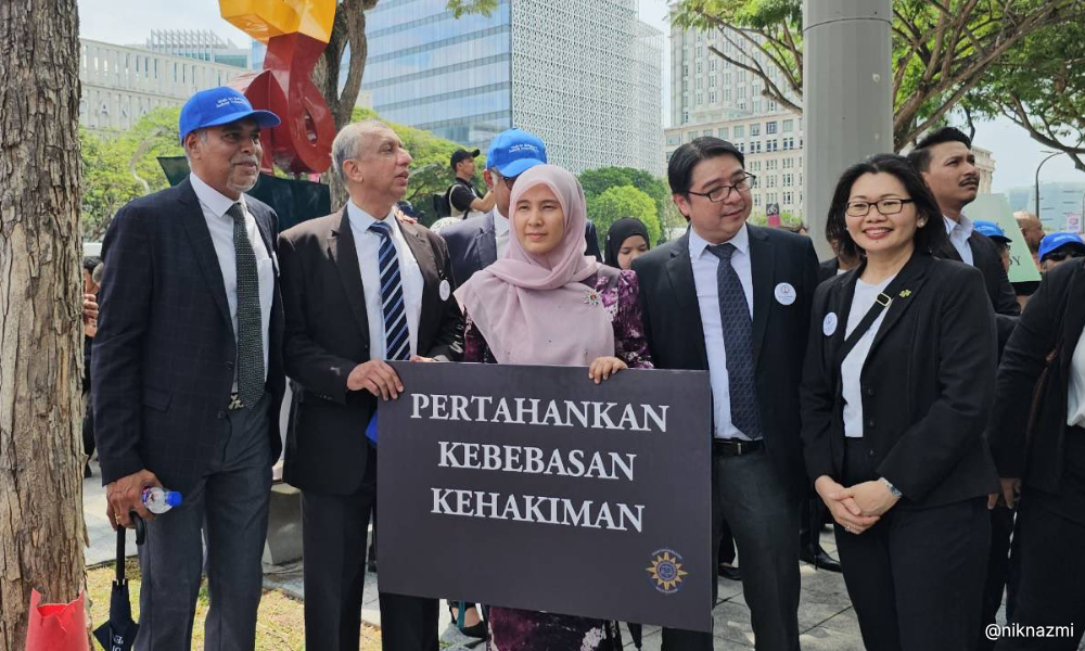 Sambil mengangkat plakad yang tertera kata-kata bertemakan kebebasan kehakiman, mereka turut melaungkan “bebas, bebas, bebas kehakiman”.