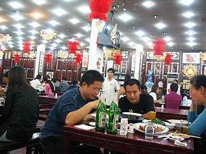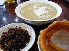一般喝豆汁必须配切得极细的酱菜,拌上辣'油,还要配套吃炸得焦黄酥透的焦圈,风'独到,一流。