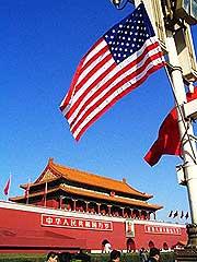 天安门依然人潮汹涌,不同的是每根灯柱都挂上中国的"星红旗及美国的红白条纹旗。这"特殊的风景,自然也吸引了不''象机的'睐。