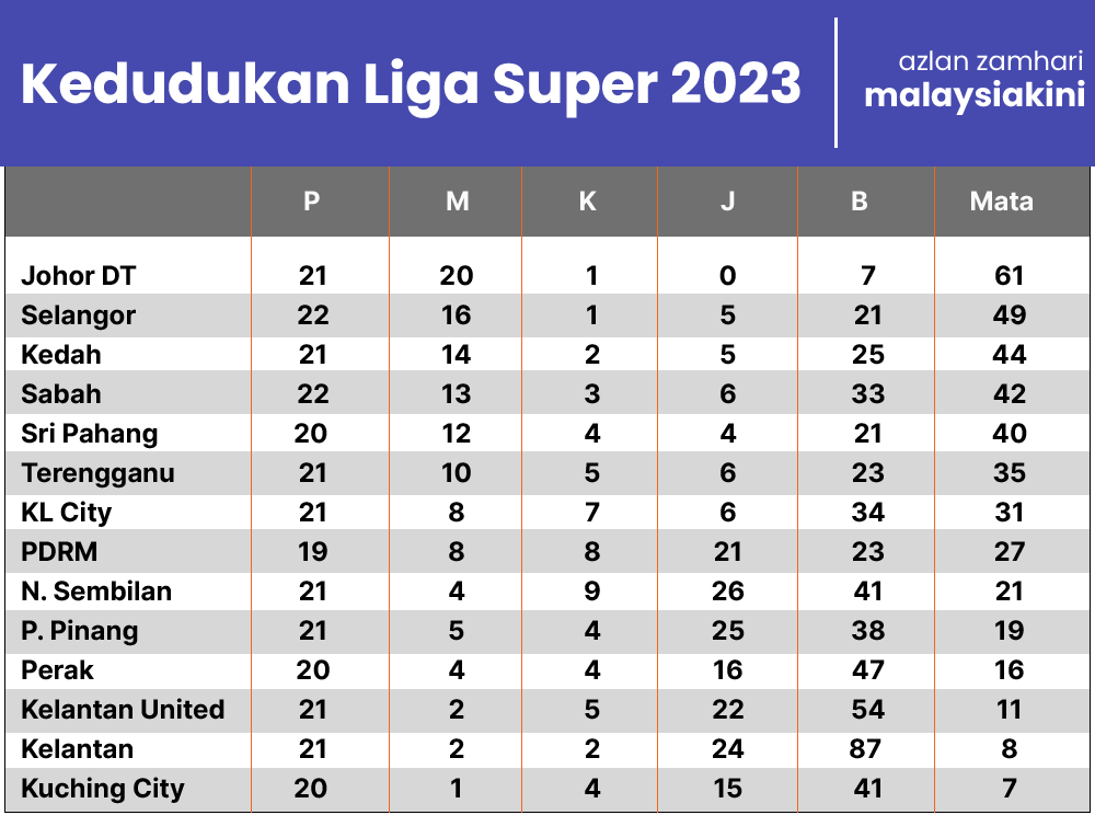 Berikut kedudukan pasukan Liga Super 2023 selepas perlawanan antara Kelantan United FC dan Kuching City FC di Kota Bharu, malam tadi: